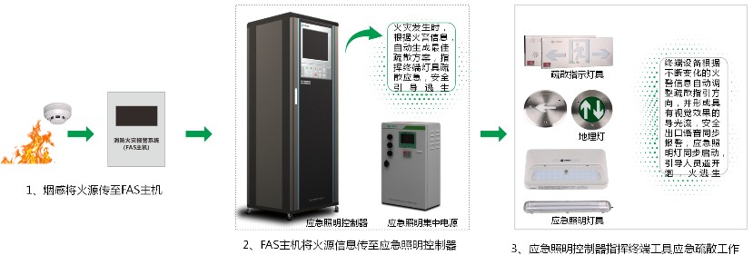 首先,煙感將火源傳至FAS(火災(zāi)報(bào)警系統(tǒng))主機(jī),F(xiàn)AS主機(jī)再將火源信息傳至應(yīng)急照明控制器,火災(zāi)發(fā)生時(shí),根據(jù)火警信息自動(dòng)生成最佳疏散方案,指揮終端燈具疏散應(yīng)急,安全引導(dǎo)逃生。