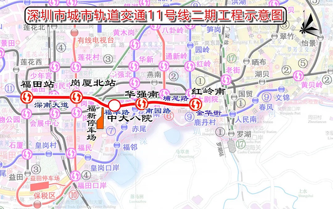 項(xiàng)目概況:深圳地鐵11號線二期起于崗廈北站(不含),主要沿深南大道、福華路、南園路、埔尾路、金華街敷設(shè),止于紅嶺南站,線路全長約4.39千米,共設(shè)3座車站:中大八院站、華強(qiáng)南站、紅嶺南站,深圳地鐵11號線二期建成后,將進(jìn)一步實(shí)現(xiàn)深圳東西向發(fā)展主軸中心間的快速通達(dá),串聯(lián)起西部寶安區(qū)、南山區(qū)與東部羅湖區(qū),實(shí)現(xiàn)城市主次中心的快速連接,助力建設(shè)軌道上的大灣區(qū)。
